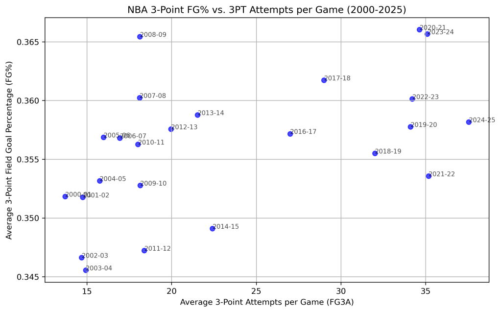 This analysis raises an important question: With the dramatic increase in three-pointers, are teams taking worse shots? There isn’t conclusive evidence to suggest so, as teams have maintained a three-point shooting percentage between 34.5% and 37.0% from 2000 to 2025. In fact, the two best shooting seasons during that span were 2020-21 and 2023-24, indicating that despite the volume increase, efficiency has remained stable—or even improved.
