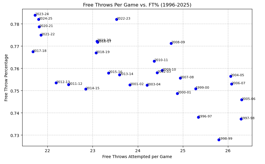 Surprisingly, when we look back to 1996, we see that free throw attempts have actually declined.