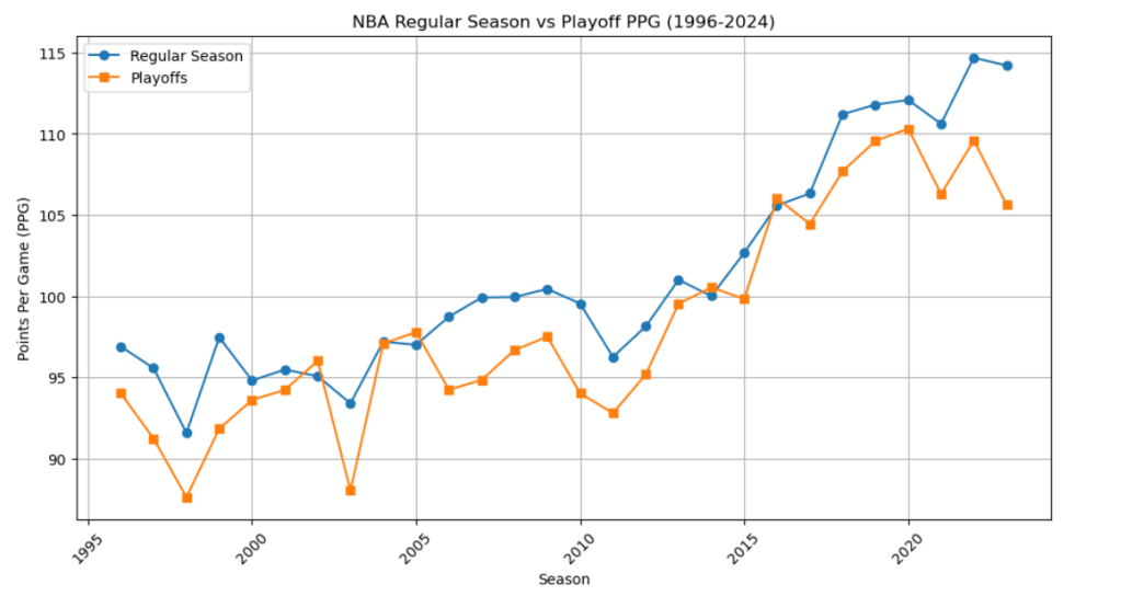 The average difference between playoff and regular season scoring is about 3 points, which aligns with the roughly 2.5 fewer possessions per game in the playoffs. However, the 2024 postseason was an outlier, with a scoring drop of 8.6 points—the largest delta since 1996.
