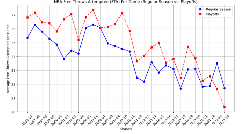 Finally, there is a slight uptick in free throw attempts during the playoffs. The increased physicality often leads to more fouls, which in turn results in more trips to the free-throw line.
