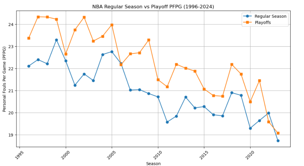 Despite more paint attempts in recent seasons, free throw attempts have still declined by 3-4 per game! This raises the question—why are teams getting into the paint more often but drawing fewer fouls?