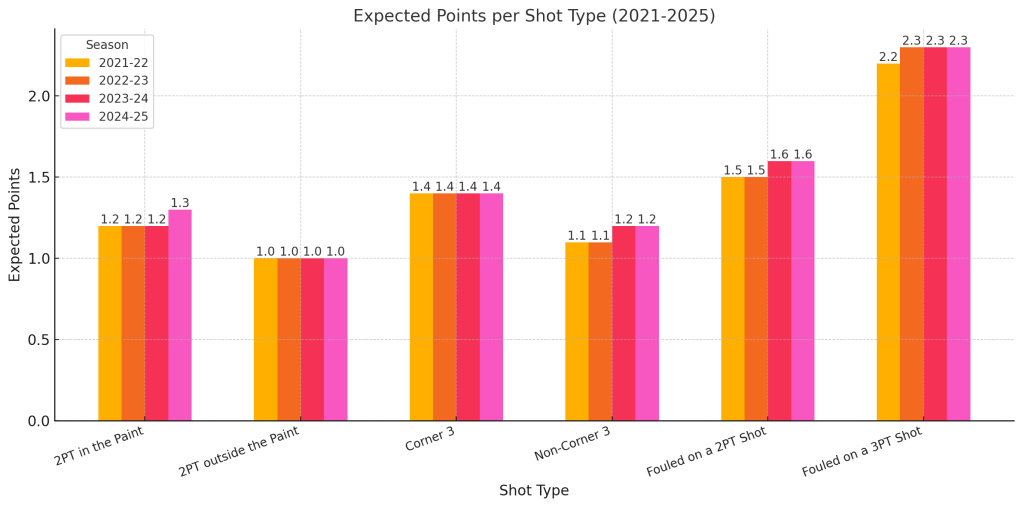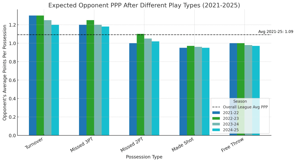 From 2021 to 2025, the average points per possession (PPP) was around 1.1. Unsurprisingly, when a team turns the ball over, the opponent tends to average 1.3 PPP, as most turnovers lead to fast breaks where the offense has a numerical advantage.
