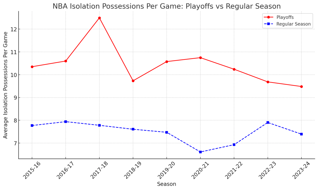Below is a comparison of average isolation attempts in the playoffs vs. the regular season, using data from NBA.com: