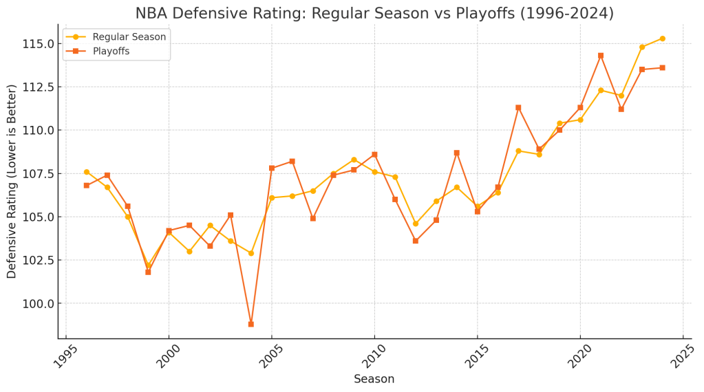 A common misnomer is that defensive intensity and efficiency are significantly higher in the playoffs. While the effort and focus may increase, this doesn’t necessarily show up in the data. In fact, defensive rating remains relatively consistent from the regular season to the playoffs.