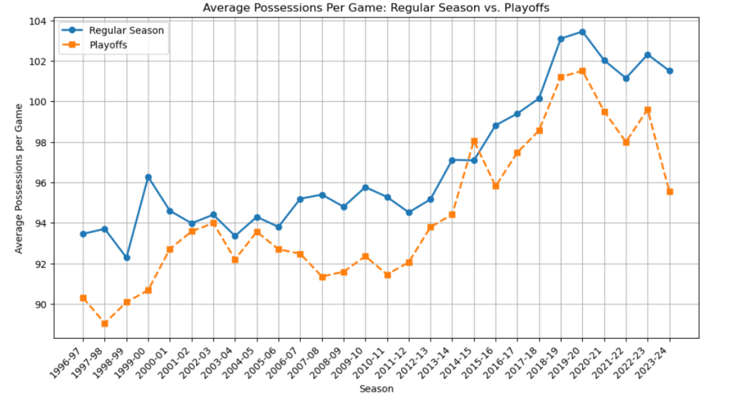 Unsurprisingly, teams exert more effort in the playoffs, which naturally leads to a slower style of play. One way this manifests is through a decrease in possessions—on average, there have been 2.5 fewer possessions per game in the playoffs compared to the regular season, dating back to 1996.