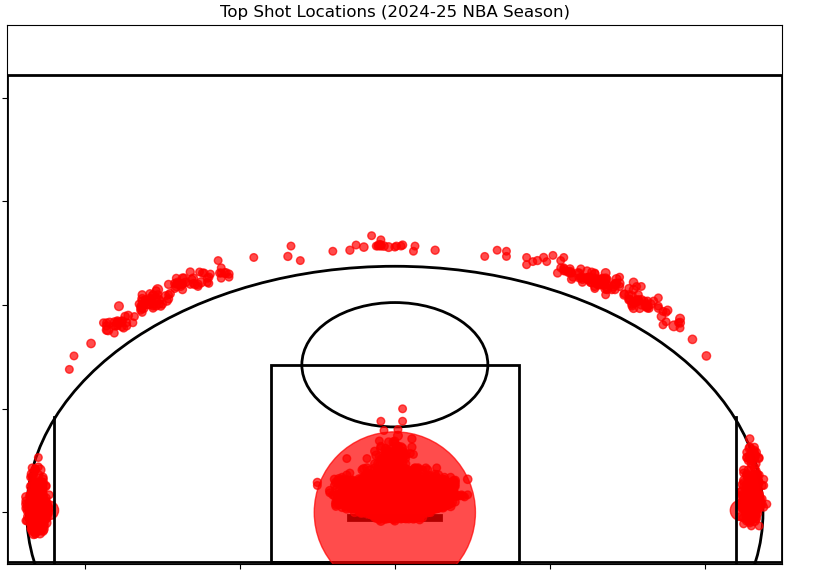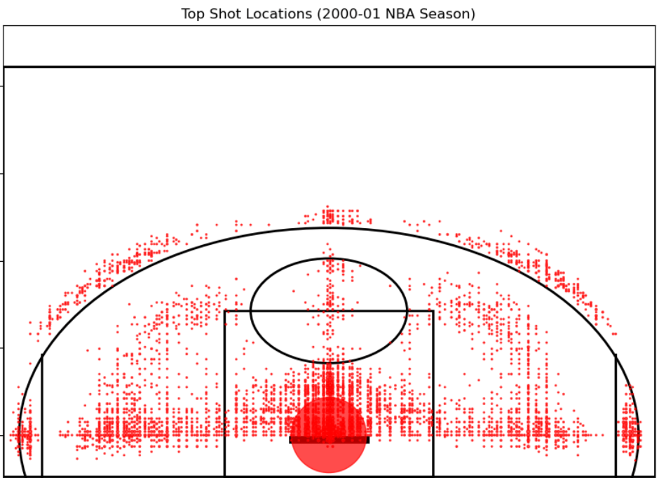 In contrast, the 2000-01 season featured a much more diverse shot selection. Teams relied on a balanced mix of shots at the rim, mid-range jumpers, and three-pointers, rather than the heavily perimeter-oriented approach seen today.