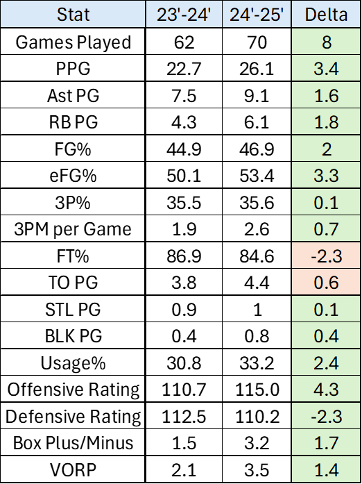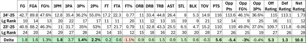 One common thread among historic NBA turnarounds is the addition of Hall-of-Fame-level talent. While a few Pistons players have certainly taken major leaps this season, Detroit didn’t land a marquee name; instead, they added complementary role players on the margins. Despite that, the transformation has been remarkable. As I’ll explore in more detail, the Pistons made several strategic adjustments, and the results are clear: statistical improvements across the board. In nearly every key metric, the team has elevated its play — going from a bottom-five team on both ends of the floor to a squad that ranks in the top half of the league in both offensive and defensive efficiency, as shown below.