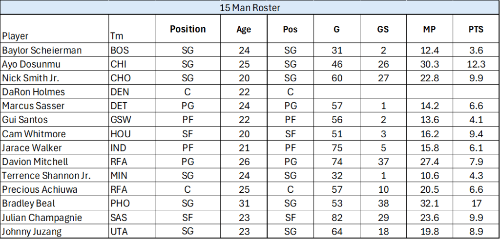 As a thought exercise, I simulated what a potential roster might look like in the event of an NBA expansion. I assumed that each existing team would be allowed to protect seven players, as opposed to the traditional eight—based on those under contract for next season, including restricted free agents. Unrestricted free agents were excluded from consideration. The expansion team was required to select a minimum of 14 players, although many of those players could be traded or waived before the start of the season. As a result, the total number of selected players exceeds the typical 15-man roster, with some picks strategically used to acquire future draft capital via trade.